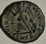 Cette monnaie a été frappée à Cyzique (Turquie actuelle) pour le 10e anniversaire de la mort de Constantin I que l'on voit ici voilé.